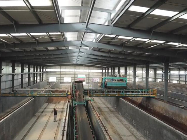 (2)太陽能發(fā)酵槽式堆肥工藝:將水分調(diào)整合適的物料通過布料車或鏟車鋪放在太陽能堆肥車間發(fā)酵槽內(nèi)。發(fā)酵槽的適宜高度1 .0一2.0米,寬度6-20米,長度50-200米不等,可按照參考養(yǎng)牛場占地面積和地塊形狀來確定。該工藝特點(diǎn):可以實(shí)現(xiàn)發(fā)酵槽一端進(jìn)料另—端出料的連續(xù)式發(fā)酵工藝,也可以實(shí)現(xiàn)滿槽式批次發(fā)酵工藝;采用強(qiáng)制性機(jī)械翻拋增氧和管路通風(fēng)充氧曝氣;太陽能堆肥車間具有極好的升溫和保溫效果及調(diào)控功能,一年四季都可以進(jìn)行堆肥生產(chǎn)。考慮到牛糞的物料特性,為節(jié)省投資,南方地區(qū)也可以以遮雨棚替代太陽能堆肥車間。
