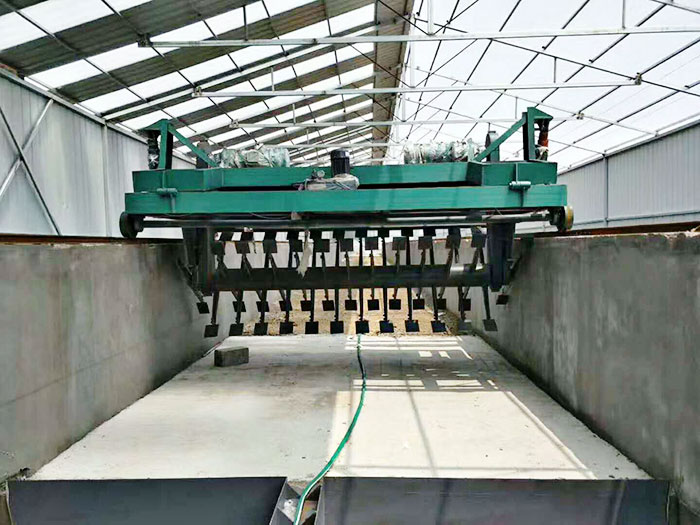③優(yōu)缺點(diǎn):行走式翻堆機(jī)采用翻拋齒旋轉(zhuǎn)的翻堆結(jié)構(gòu)與自動(dòng)行走系統(tǒng),翻堆時(shí)可根據(jù)料堆的深度進(jìn)行升降,因此翻堆徹底,效率高,翻堆和輸送同時(shí)完成,機(jī)器邊行走邊翻堆自動(dòng)完成全部工作過(guò)程,實(shí)現(xiàn)流水式有機(jī)肥生產(chǎn)。翻堆期間可以使用行走式翻動(dòng)翻堆機(jī),受天氣影響小、占地面積小、周期短、節(jié)省人力,一機(jī)多槽使用,處理能力強(qiáng),操作簡(jiǎn)單自動(dòng)化生產(chǎn),設(shè)備投資成本也相對(duì)較低。缺點(diǎn)是攪拌機(jī)與堆料接觸部分高速旋轉(zhuǎn)易磨損,且與糞便混合物直接接觸容易被腐蝕,需要進(jìn)行維護(hù)和更換。