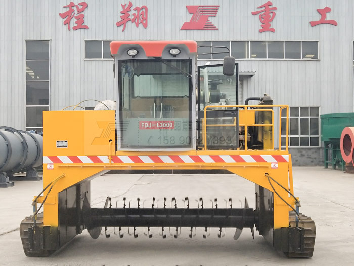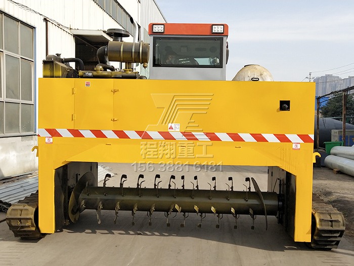 2.行駛中整車騎跨在預(yù)先堆置的長(zhǎng)條形堆體上,由機(jī)架下掛裝的旋轉(zhuǎn)刀軸對(duì)堆體原料實(shí)施翻拌、蓬松、移堆,車過(guò)之后篡成新的條形垛堆。